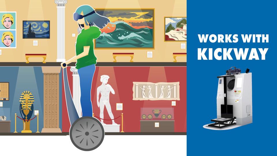 「VRライドギャラリー」は、ハシラスが開発した省スペースなVRライドデバイス「キックウェイ」に搭乗し、VR内の美術館をめぐるライドアトラクションです。アニメやゲームなどのコンテンツの素材を活用し、IPの世界観を没入的に味わえる体感型VRを手軽に作成できます。