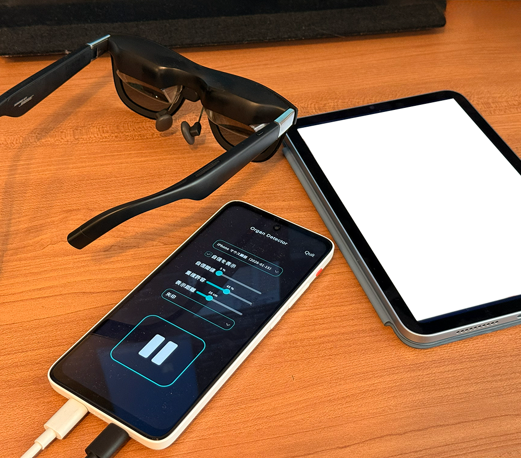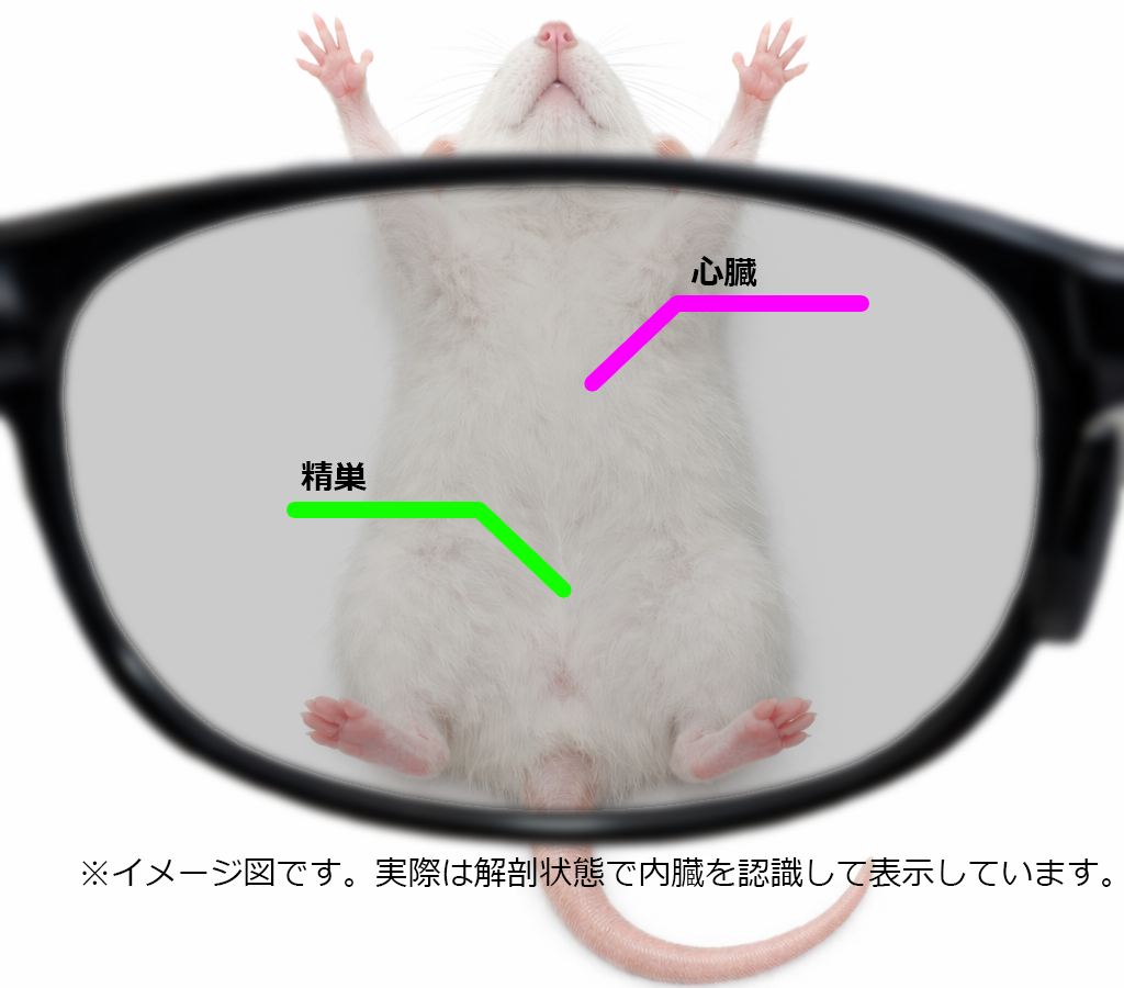 XREAL社のARグラスを使用し、AIによる映像認識で実験用マウスの臓器認識を行う研究開発です。